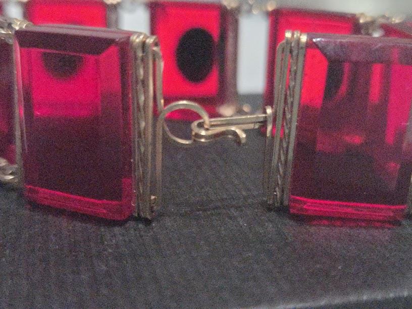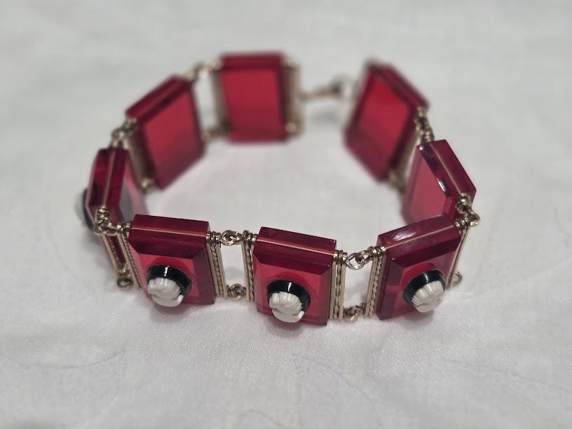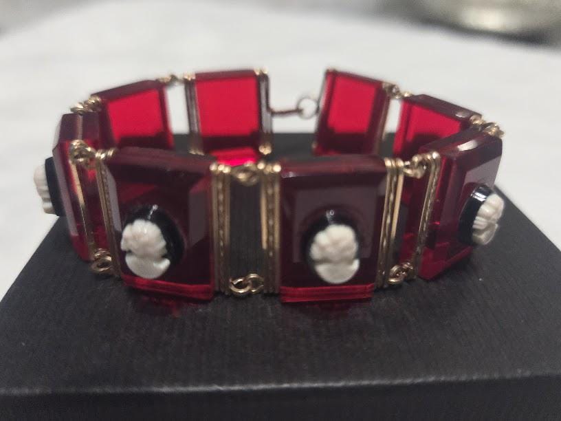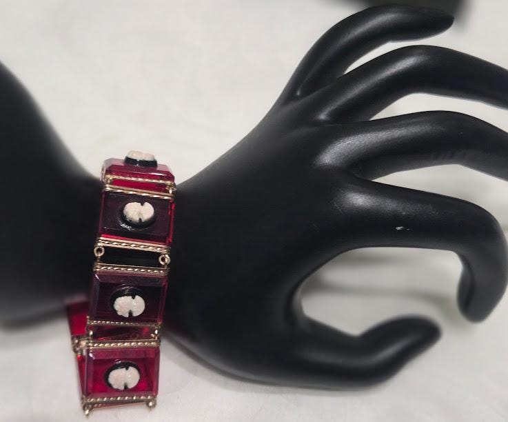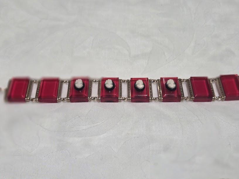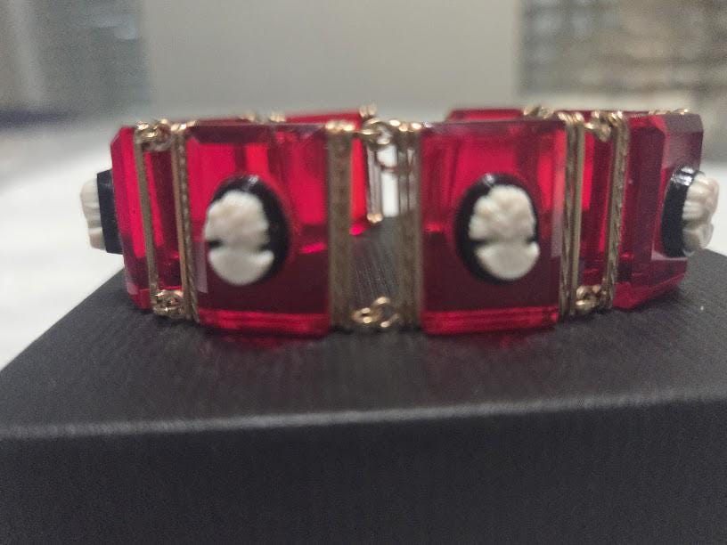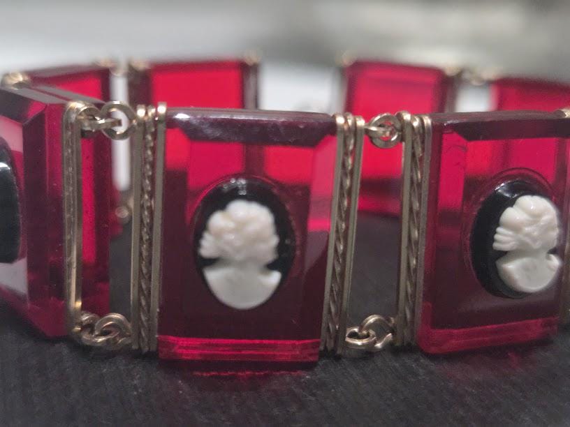 Red Lucite tile with black/white cameos on each tile.