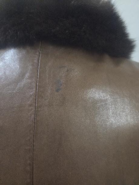 Just a minor discoloration on top back of jacket. (see fourth picture)