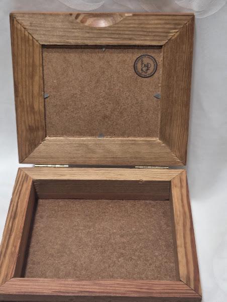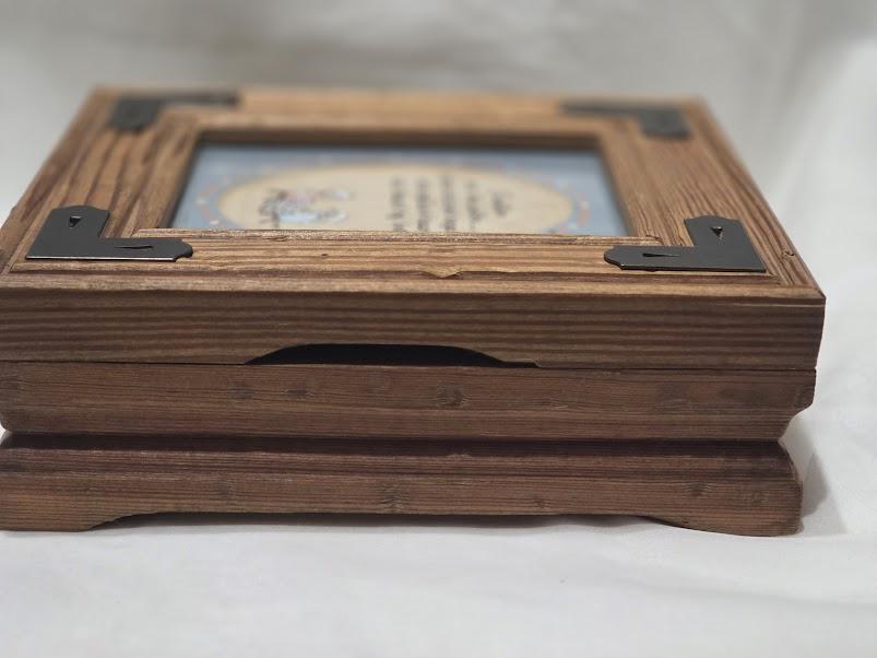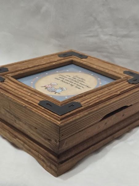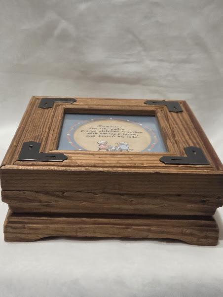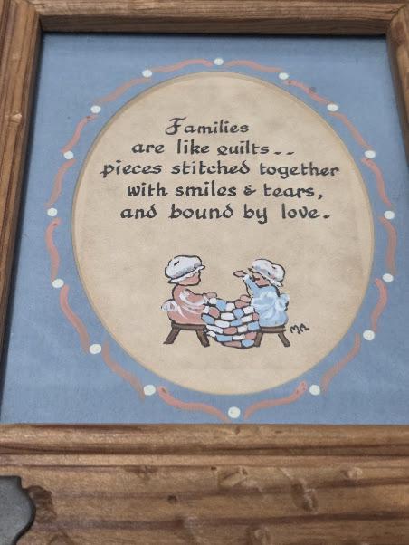 Picture frame lid with quote "Families are like Quilts--Pieces stitched together with smiles & tears and bound by love.