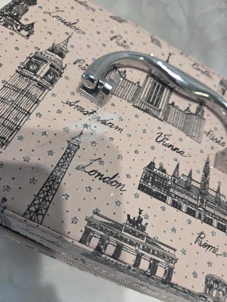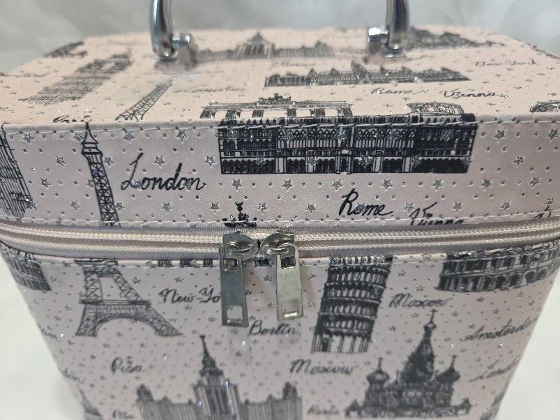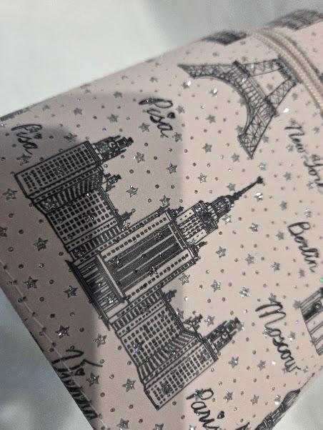 Pretty pale pink with black art of famous cities (Paris, New York, Berlin)