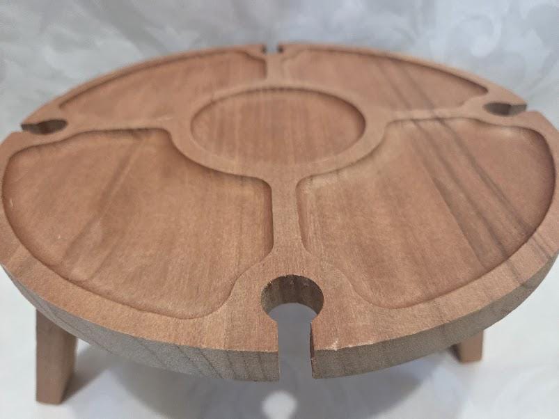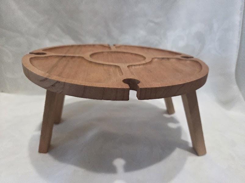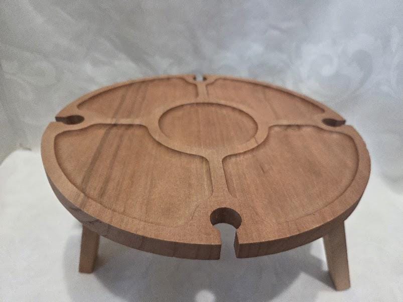Charcuterie board table with collapsible legs for indoor and outdoor use.
