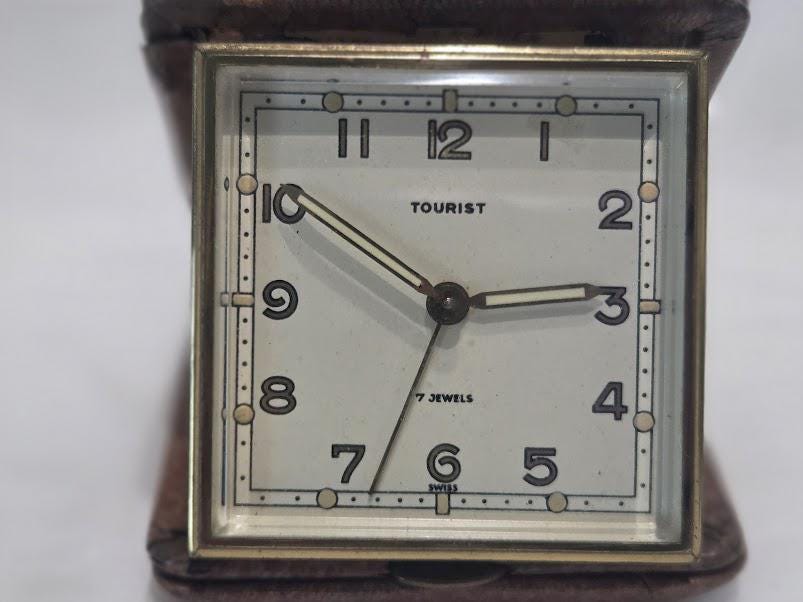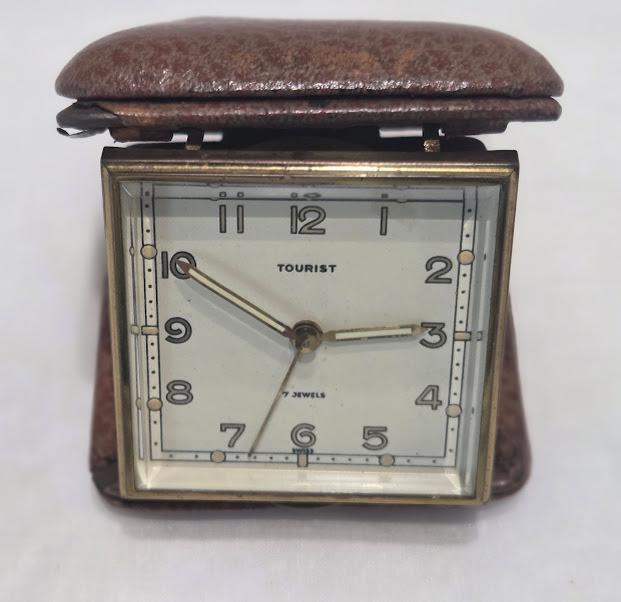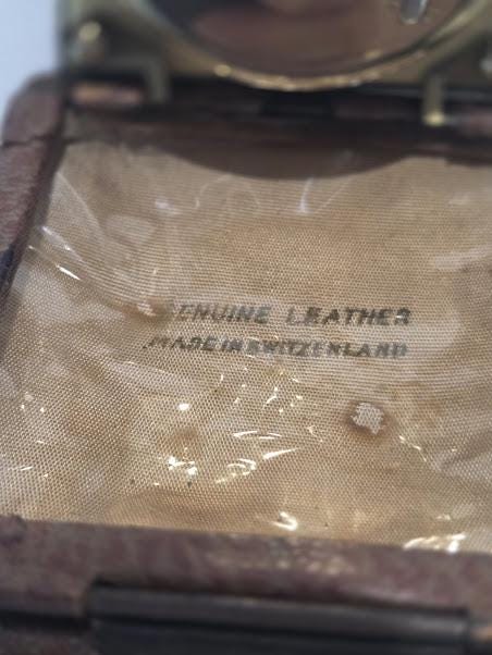 Foldable leather brown case. Mechanical spring wound....7 Jewel