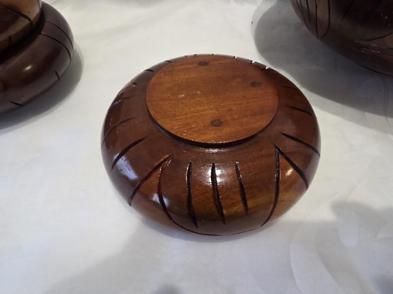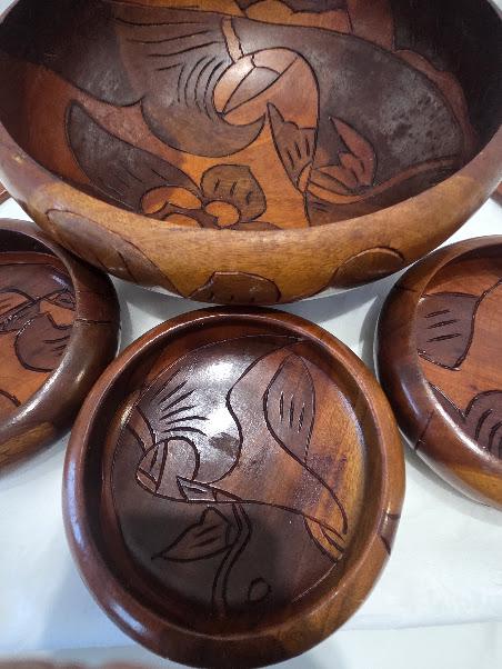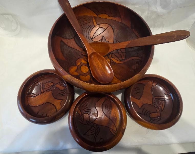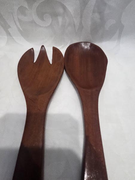 The wood salad serving bowl and accessories are in very good vintage condition.
