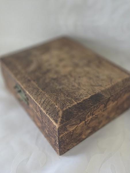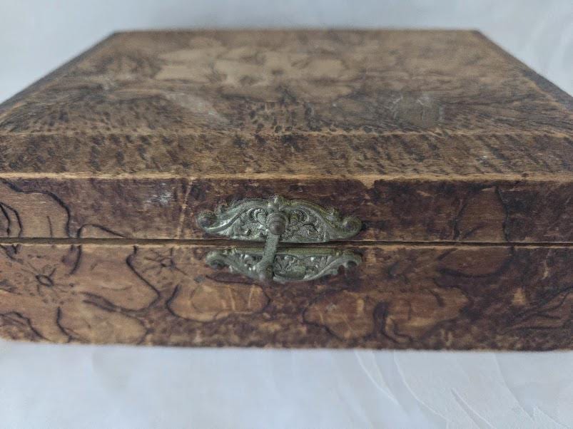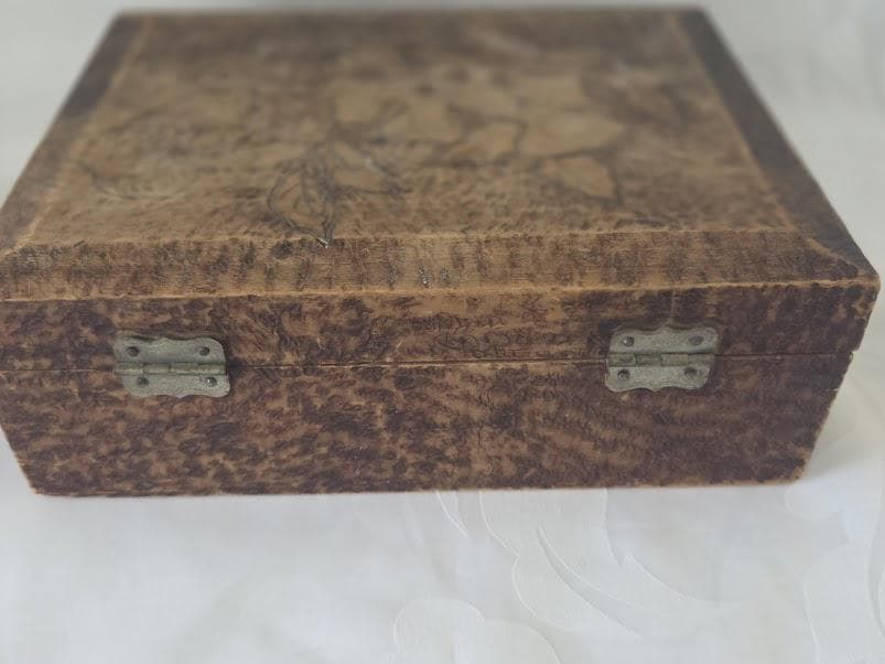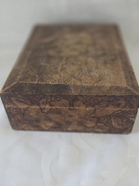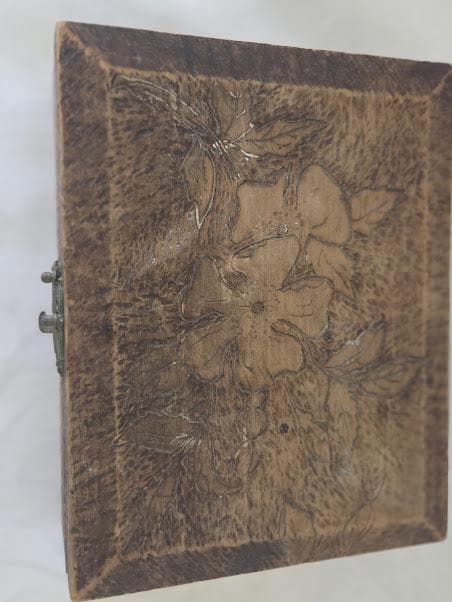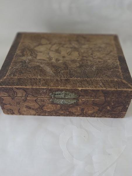 This art pyrography floral designed trinket/storage wood box is in very good antique condition.