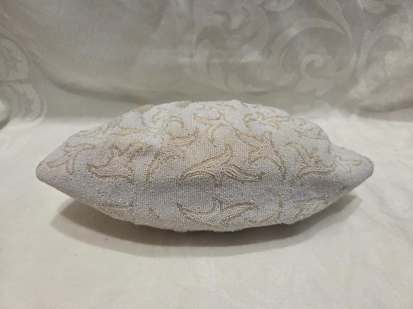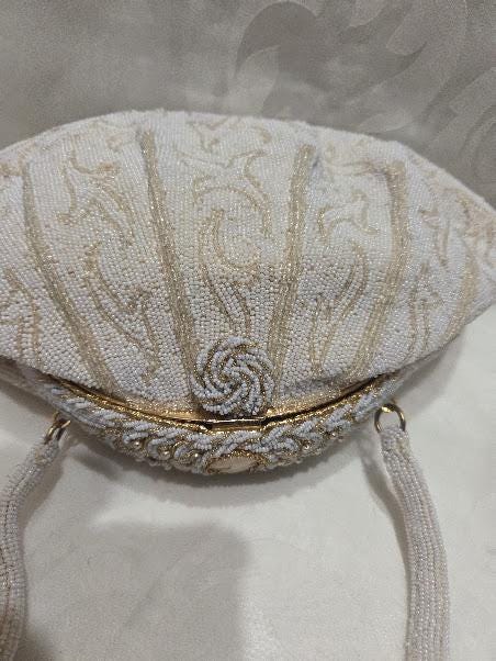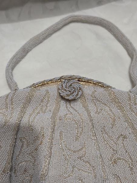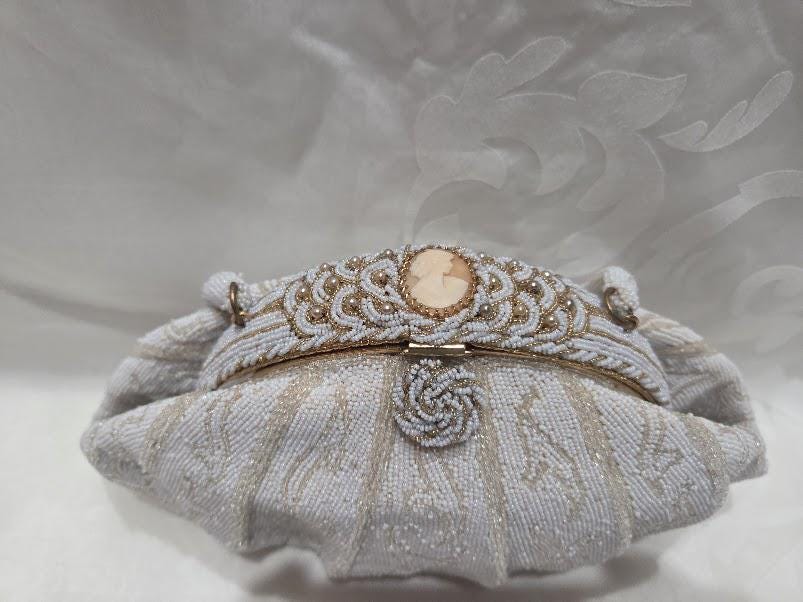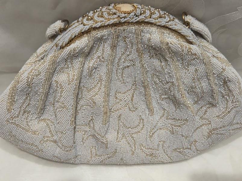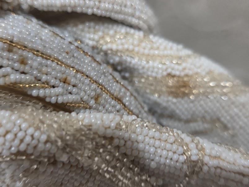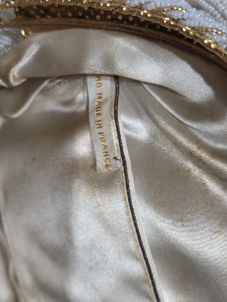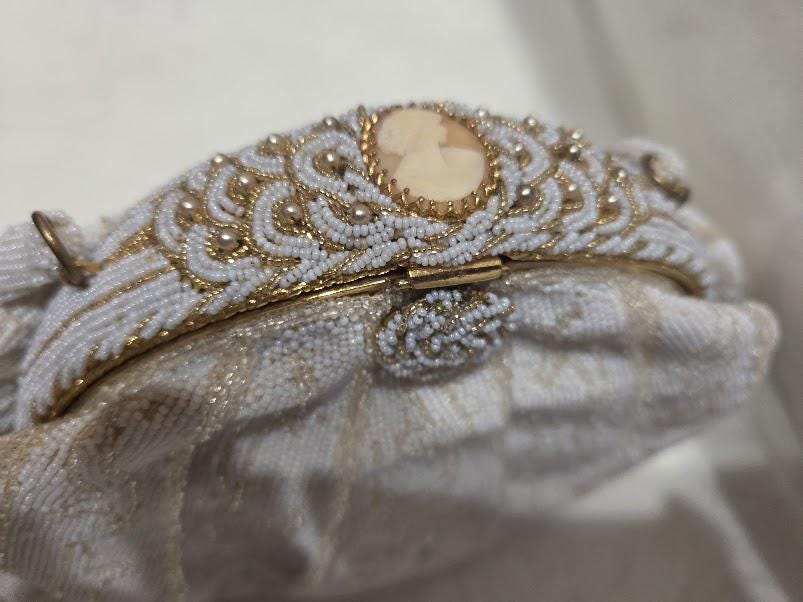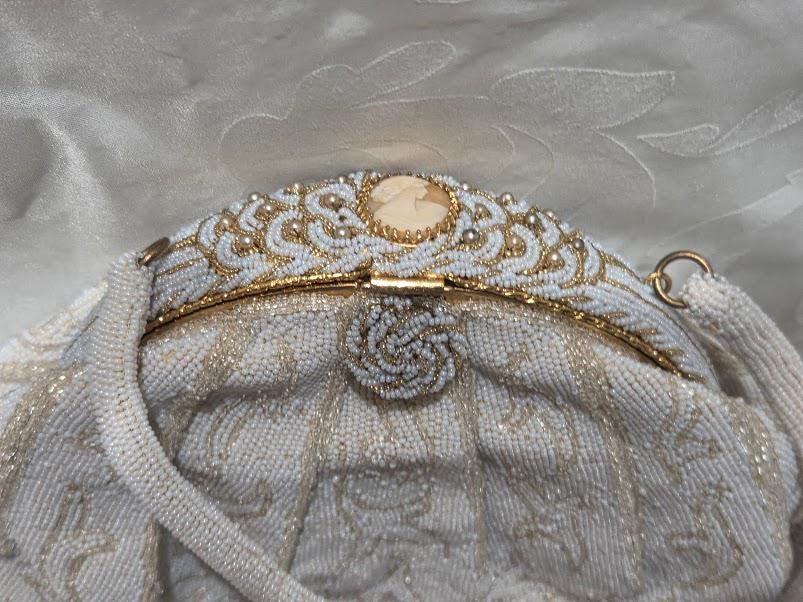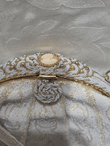 No missing seed beads. The color is a white cream and gold beads with a gold tone metal frame and a cameo clasp. Hand made in France.
