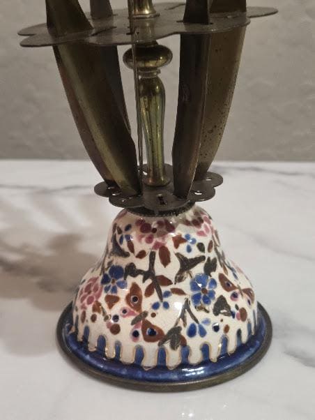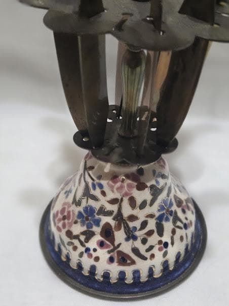Blades appear to be Bronze, and the Caddy is also bronze and Porcelain.