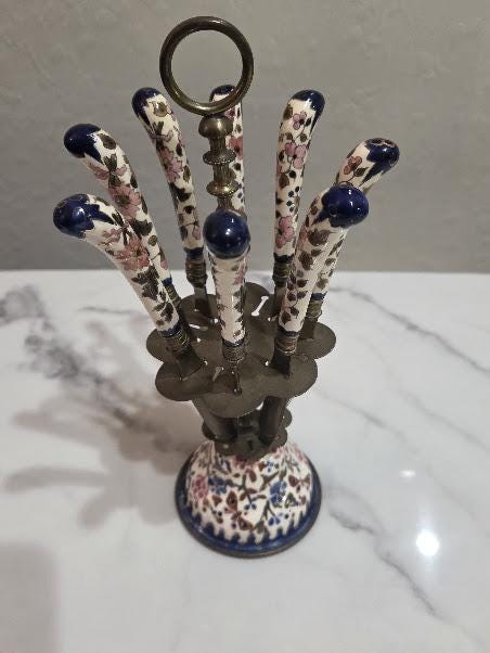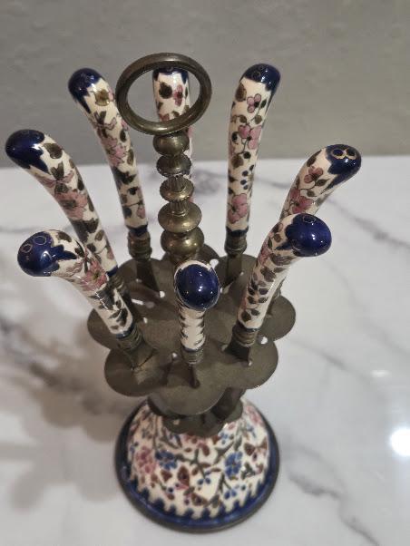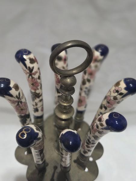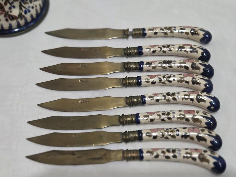 The handles are a Pink, Red and navy floral motif. Meissen style porcelain handles.
