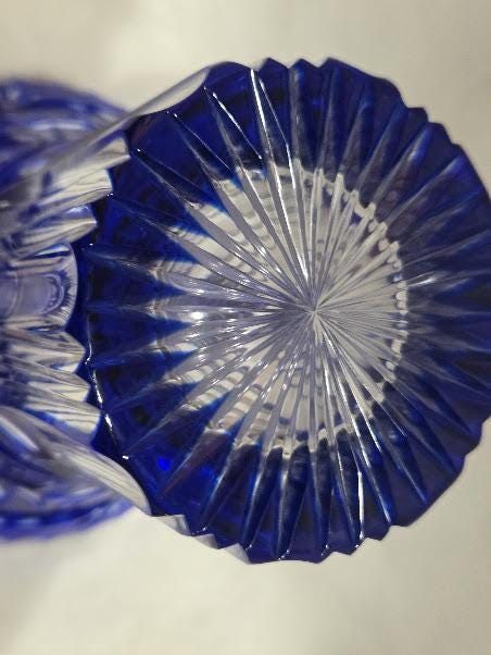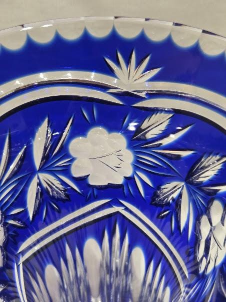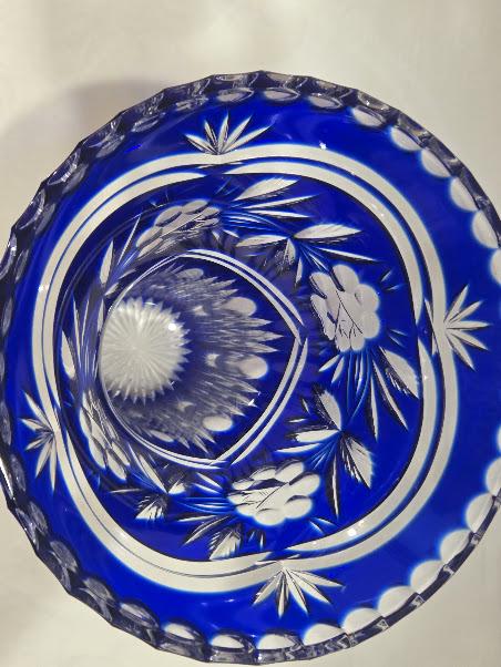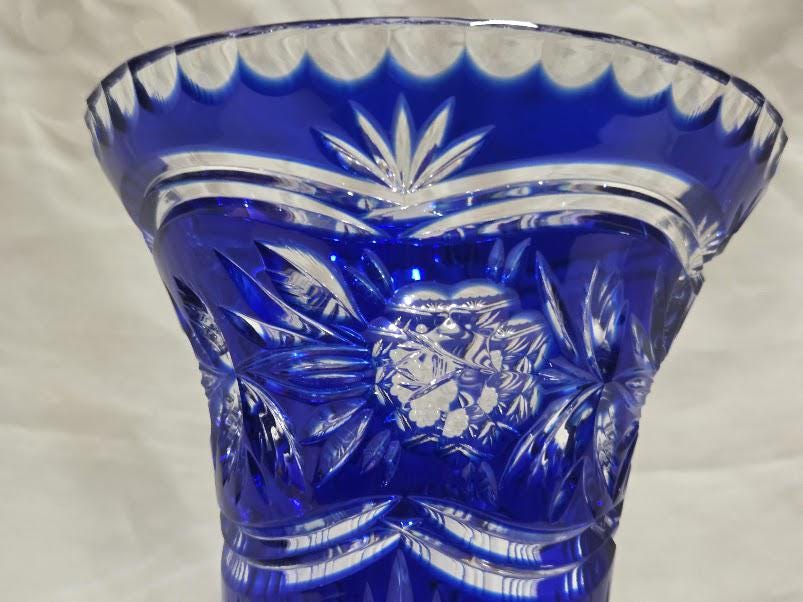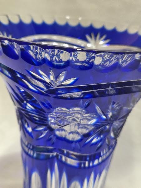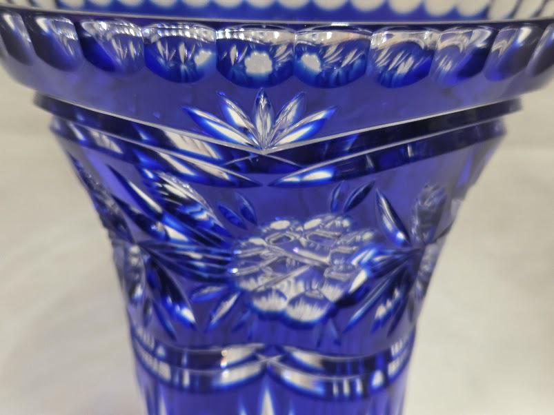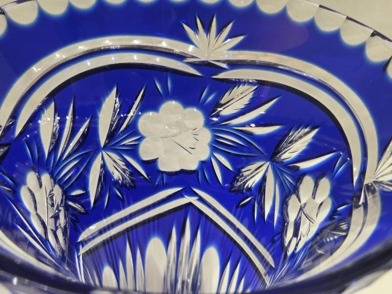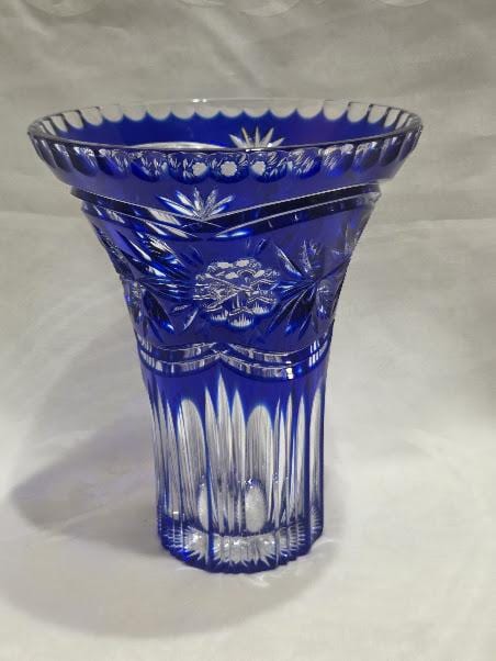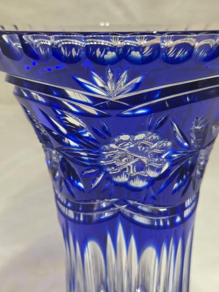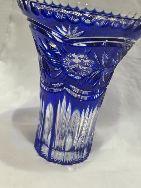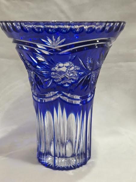 Cobalt crystal vase with intricate hand cut flowers and starburst design.