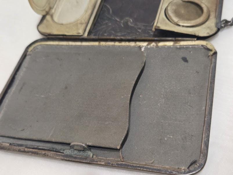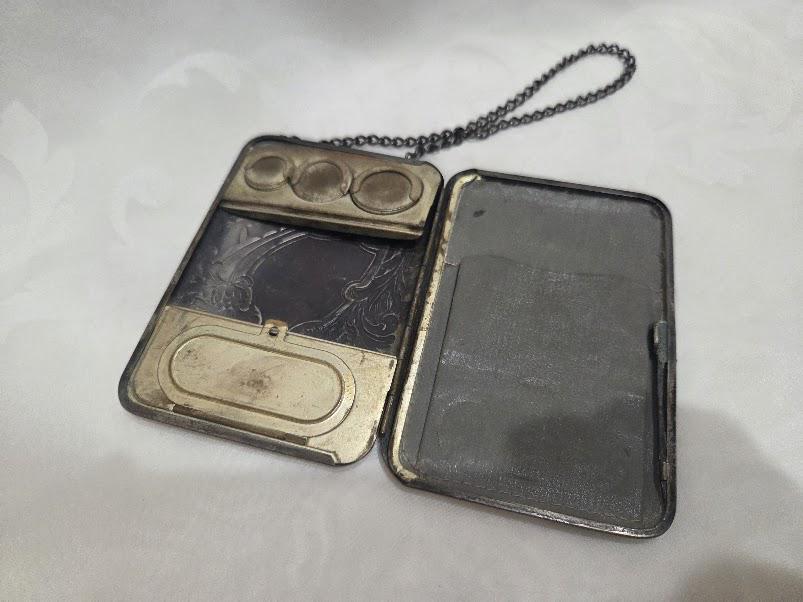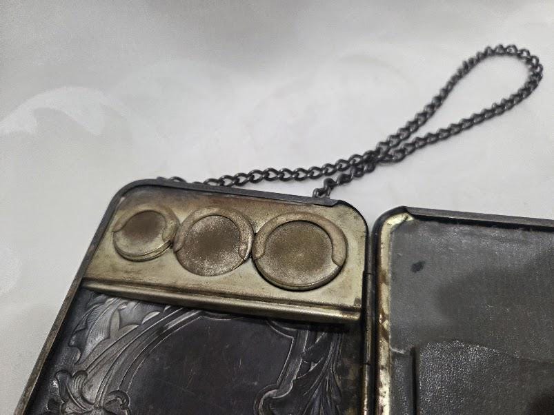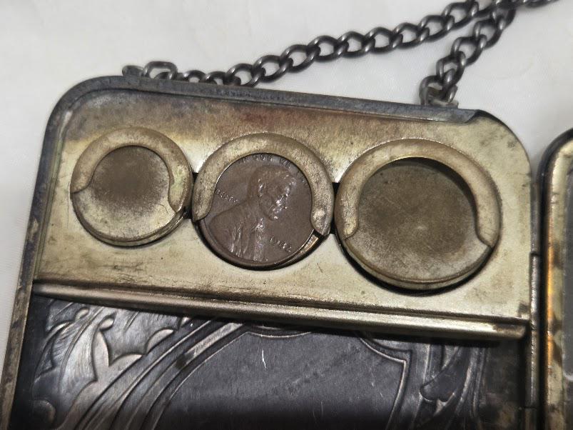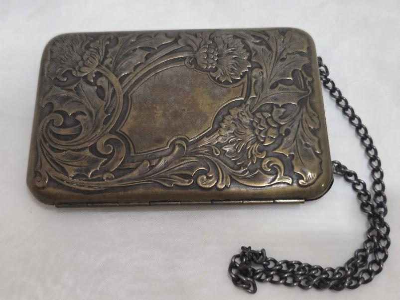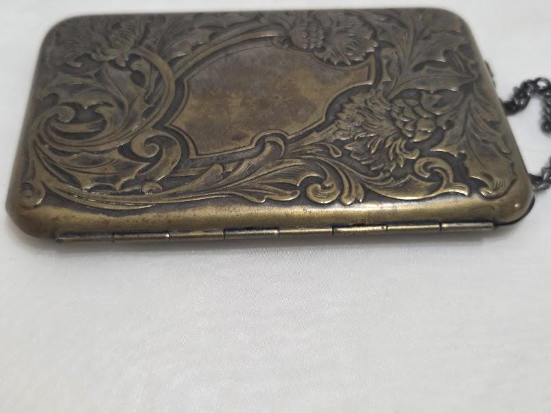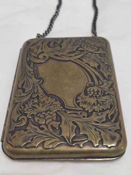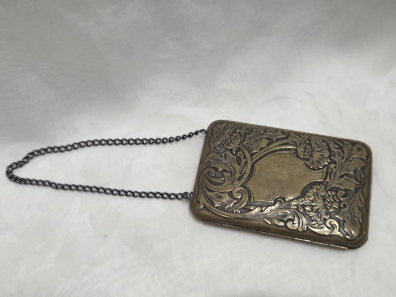 Measures: 4 3/4 inches long X 3 1/4 inch wide with brass writs chain.