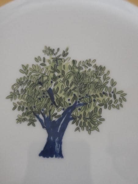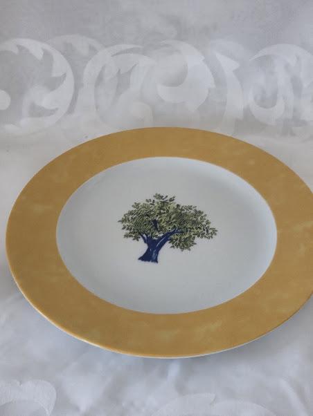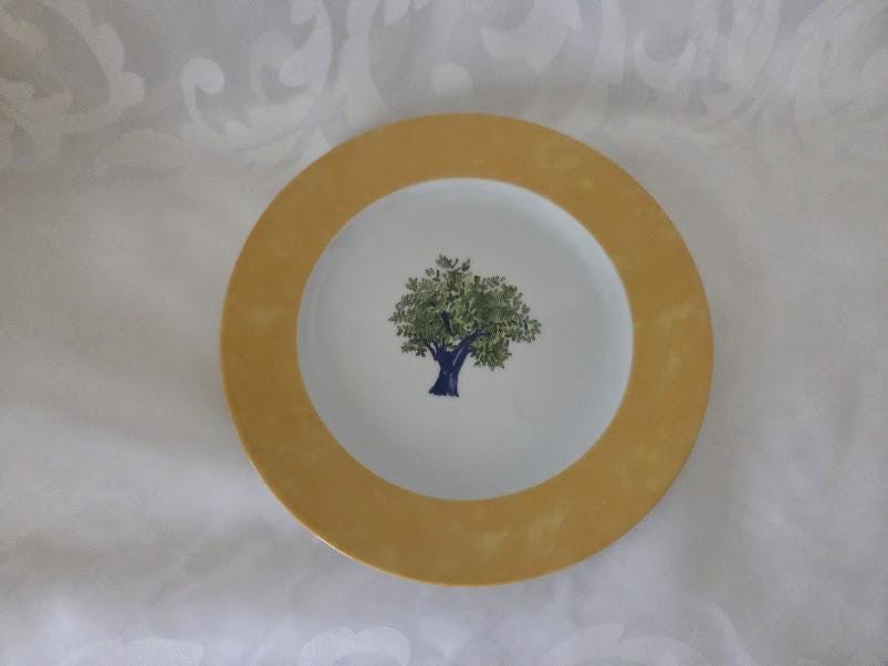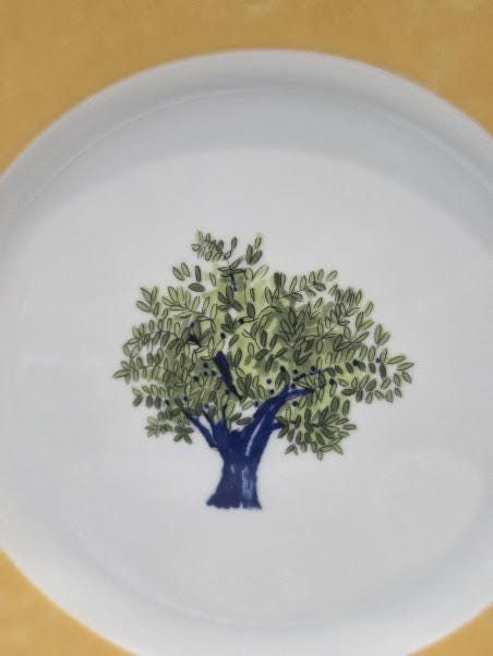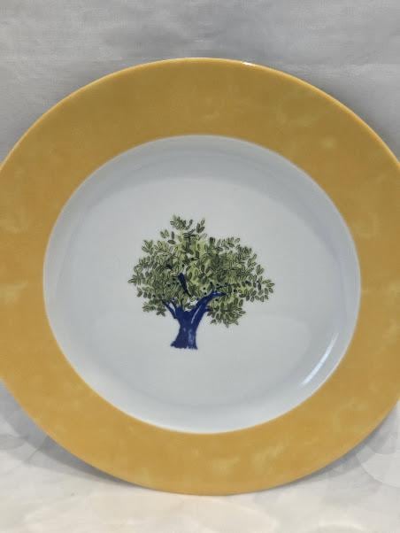 Eight inches round. Center Green Olive tree/ Yellow border.