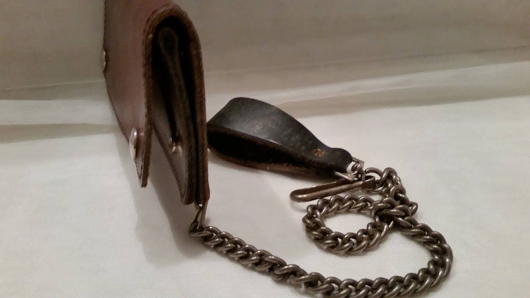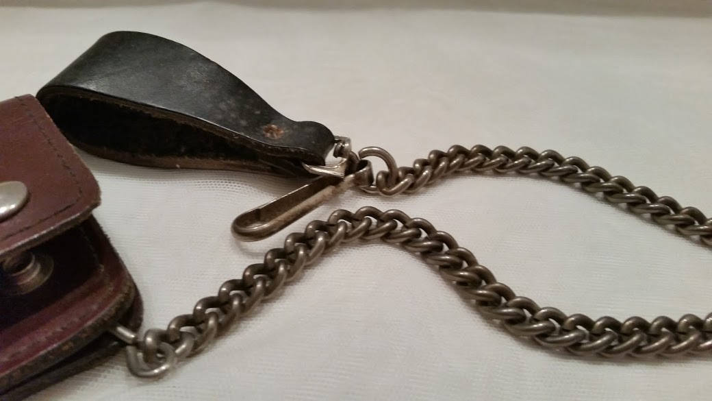 Chain is 12 inches long up to (2 3/4 )inch leather belt hoop.