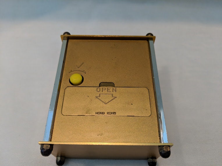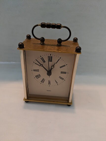 This Gold color desk clock is in very good vintage condition. (Color on metal top handle and top screws has worn) Actually adds Character to the piece.